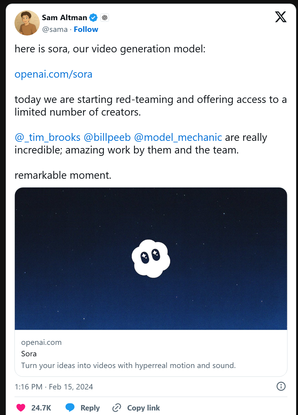 On Thursday this week (Feb 15), Sam Altman, CEO of OpenAI (ChatGPT, DALL-E) released a sneak peek into our not-to-distant future of realistic AI generated text-to-video content with the announcement of their new model, Sora on a “Xitter” post: